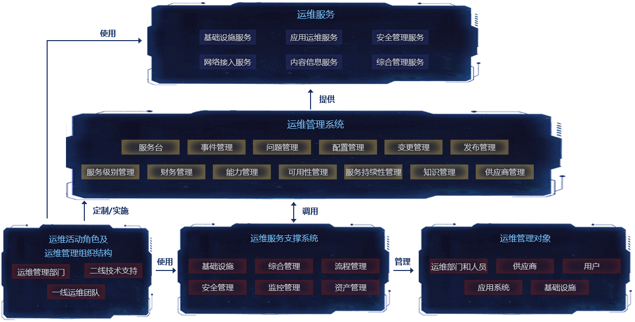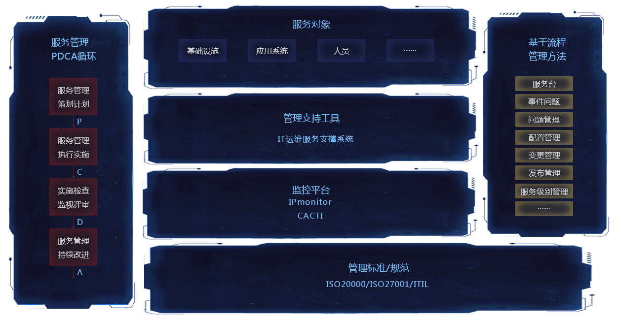 运维管理体系采用ISO9000系列标准,并参考ITIL框架规定的方法进行编制,以适应各种管理模式为目标,以管理支撑工具为手段,以流程化、规范化、标准化管理为方法,以全生命周期的PDCA循环为提升途径,体体现了对运维服务全过程的体系化管理。